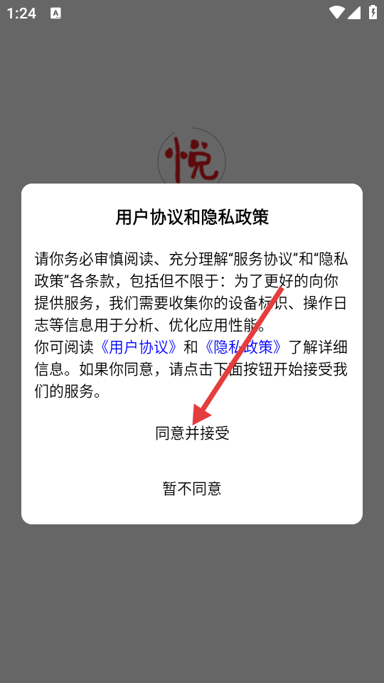 1、在“用户协议和隐私政策”弹窗中,点击【同意并接受】,进入APP首页。