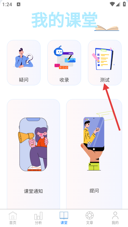 3、在“我的课堂”页面,点击【测试】,进入测试题目页面。