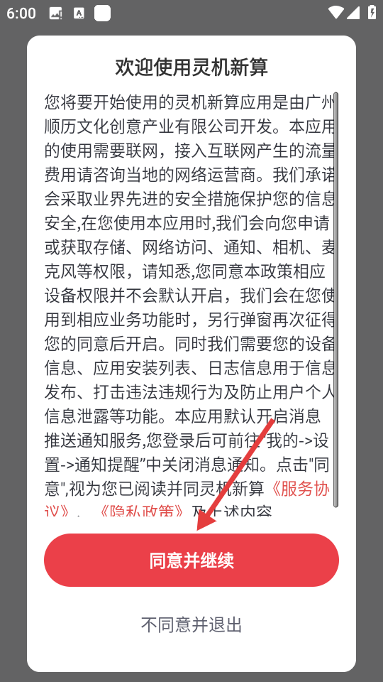 1、在“欢迎使用灵机新算”弹窗中,点击【同意并继续】。