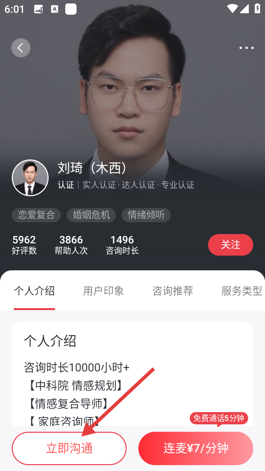 3、在咨询师个人页面,点击【立即沟通】按钮。