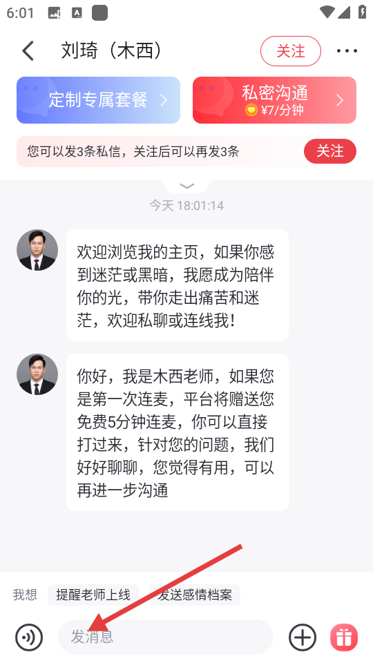 4、进入与刘琦(木西)的沟通界面后,点击【发消息】即可开始交流。