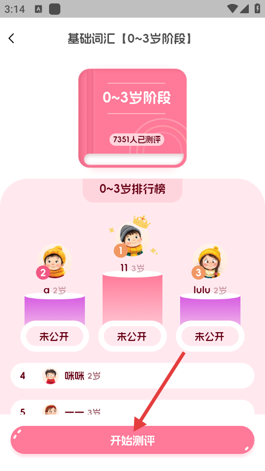 3、在基础词汇【0~3岁阶段】页面,点击【开始测评】按钮。