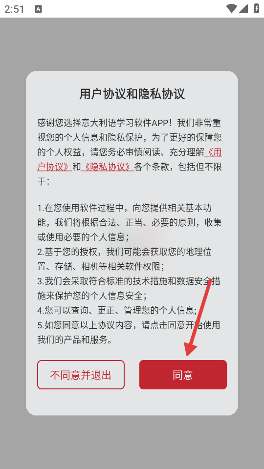 1、在“用户协议和隐私协议”弹窗中,点击【同意】按钮。