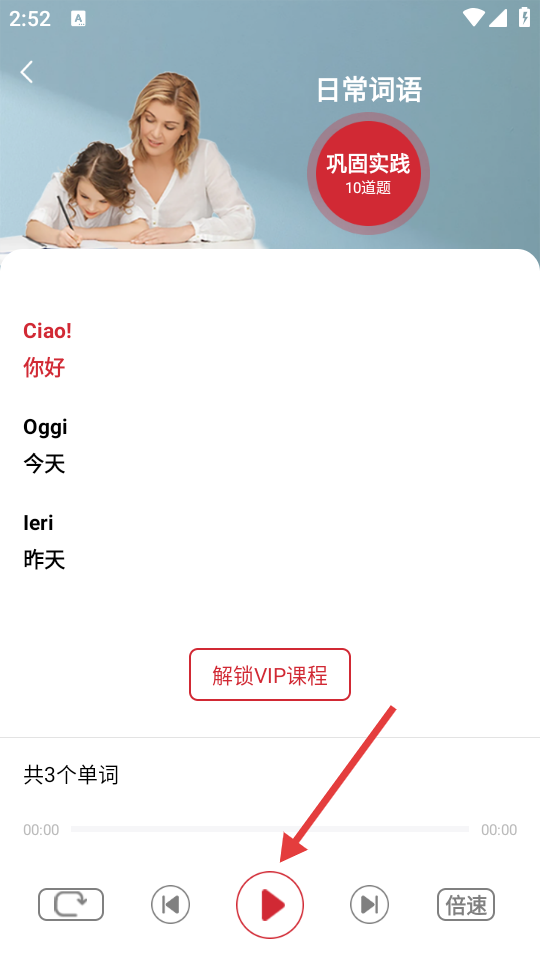4、进入日常词语学习页面后,点击底部的播放按钮,即可开始学习日常词语。