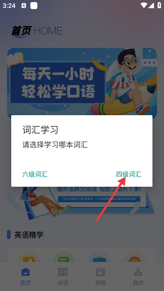 2、在弹出的“词汇学习”对话框中,点击【四级词汇】选项。