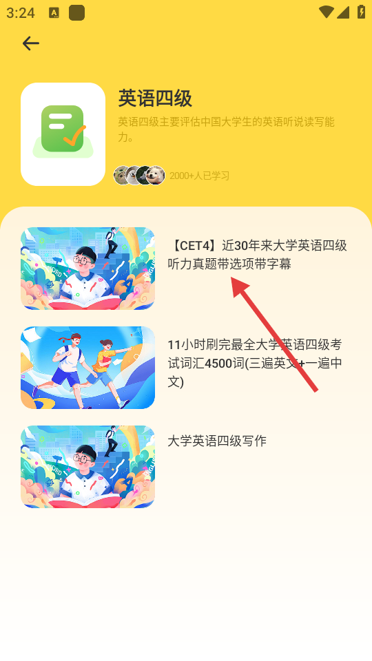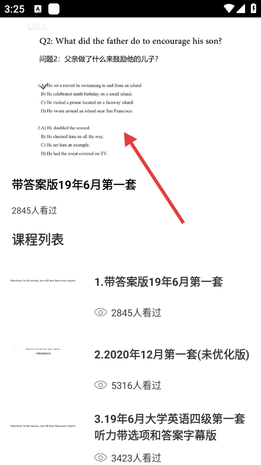 4、进入听力真题页面后,即可查看听力题目及相关课程列表进行学习。