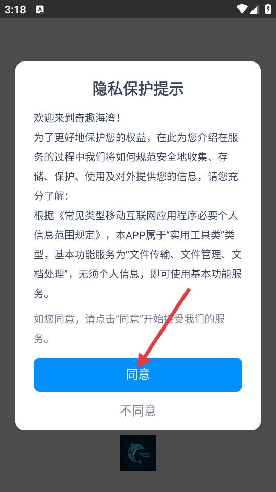 1、在“隐私保护提示”弹窗中,点击【同意】按钮。