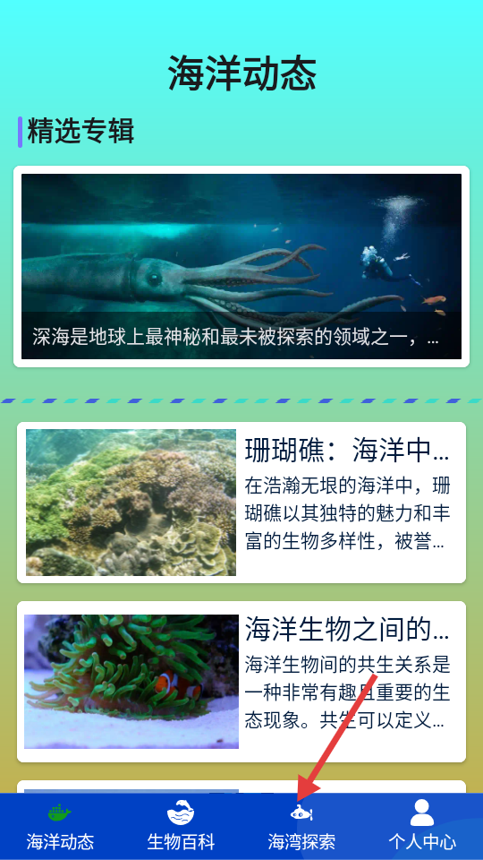 2、进入主页面后,点击底部导航栏中的【海湾探索】选项。