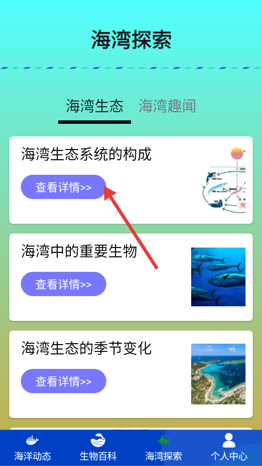 3、在海湾探索页面,找到“海湾生态系统的构成”板块,点击【查看详情】按钮。