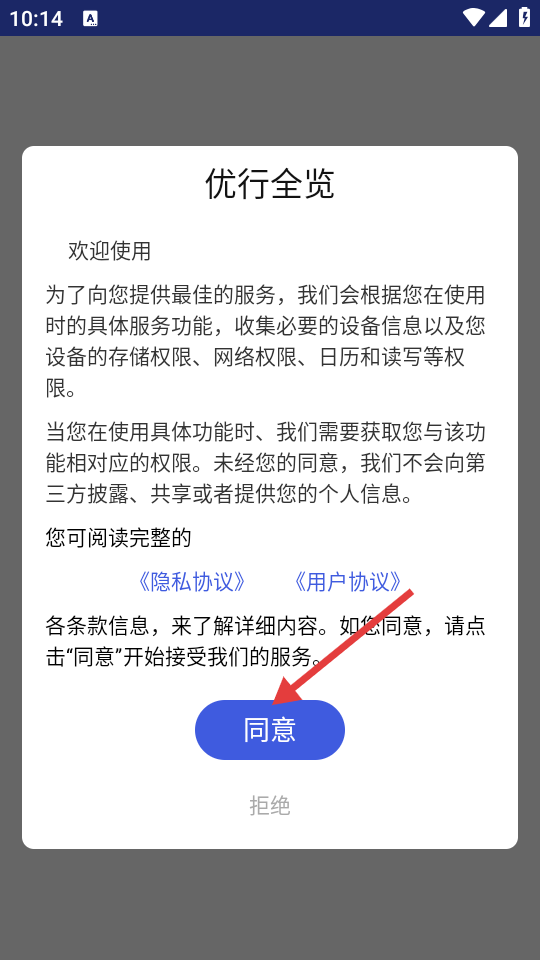 1、在“优行全览”提示弹窗中,点击【同意】按钮。