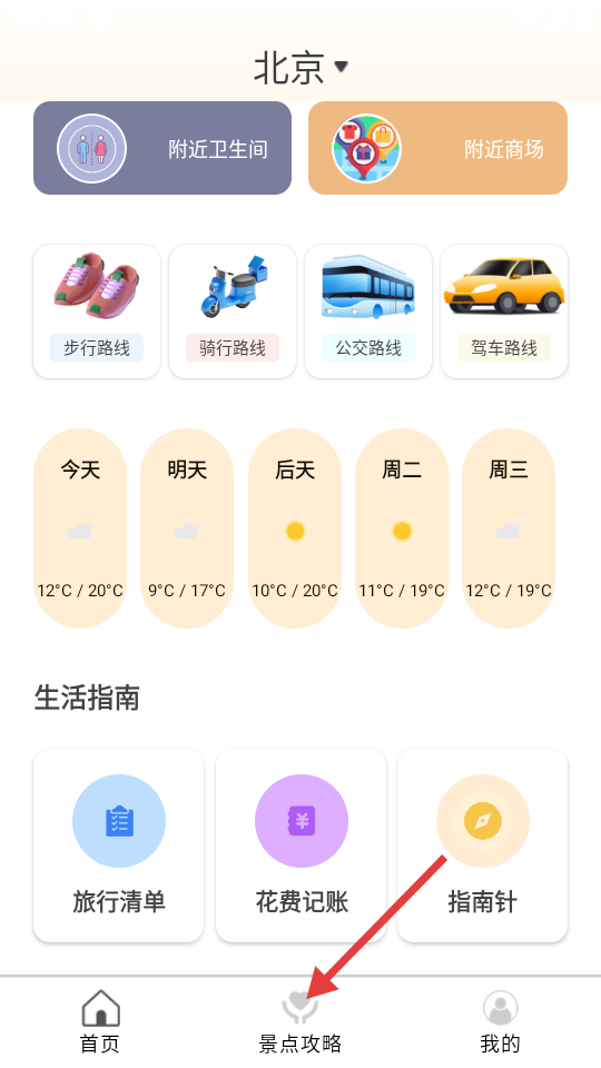 2、进入主页面后,点击底部导航栏中的【景点攻略】选项。