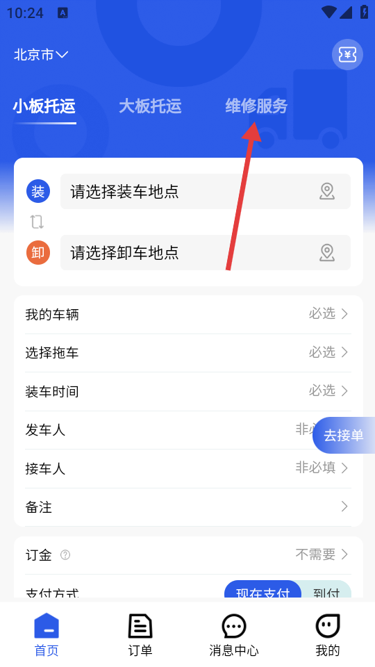 1、通过订单发布功能填写车辆信息和运输要求,系统会自动推送给附近可用承运方并快速生成服务报价。
