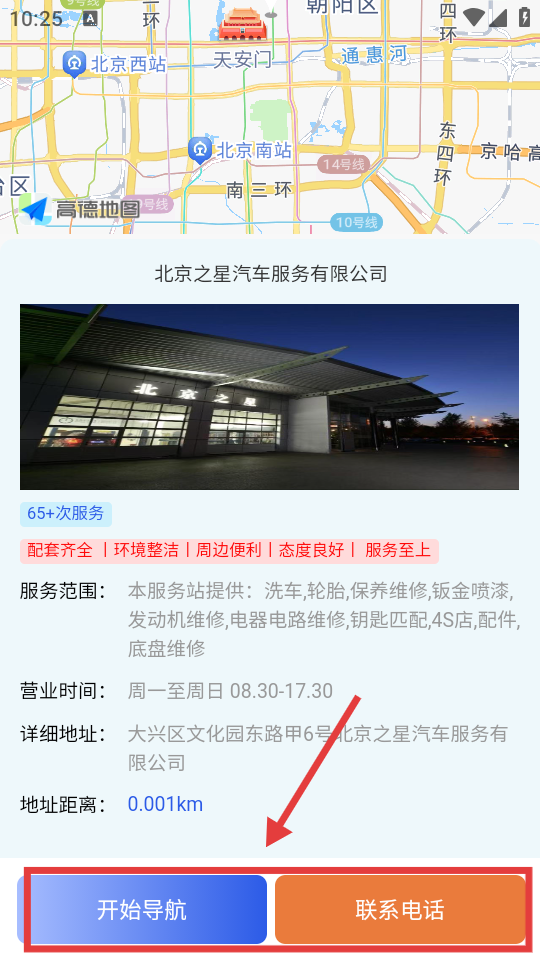 4、进入汽车服务公司详情页面后,可点击【开始导航】前往该公司,或点击【联系电话】与该公司取得联系。