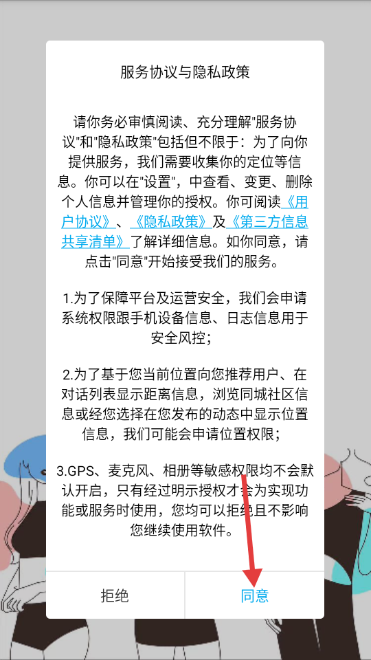 1、在“服务协议与隐私政策”弹窗中,点击【同意】按钮。