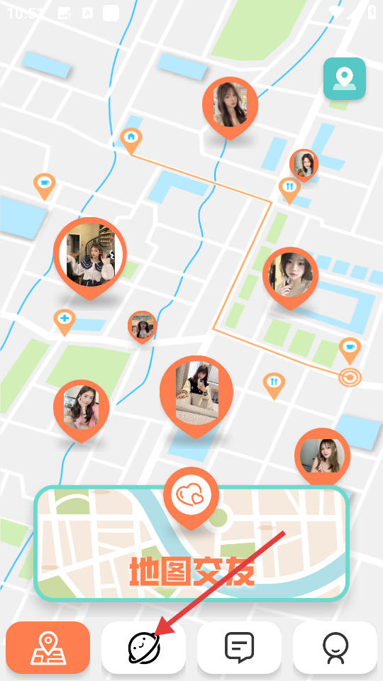 2、进入地图交友页面后,点击底部导航栏中的动态图标。