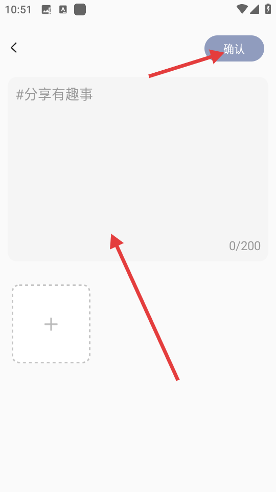 4、进入动态发布页面后,在输入框中输入内容,可点击下方“+”号添加图片,最后点击【确认】按钮发布动态。