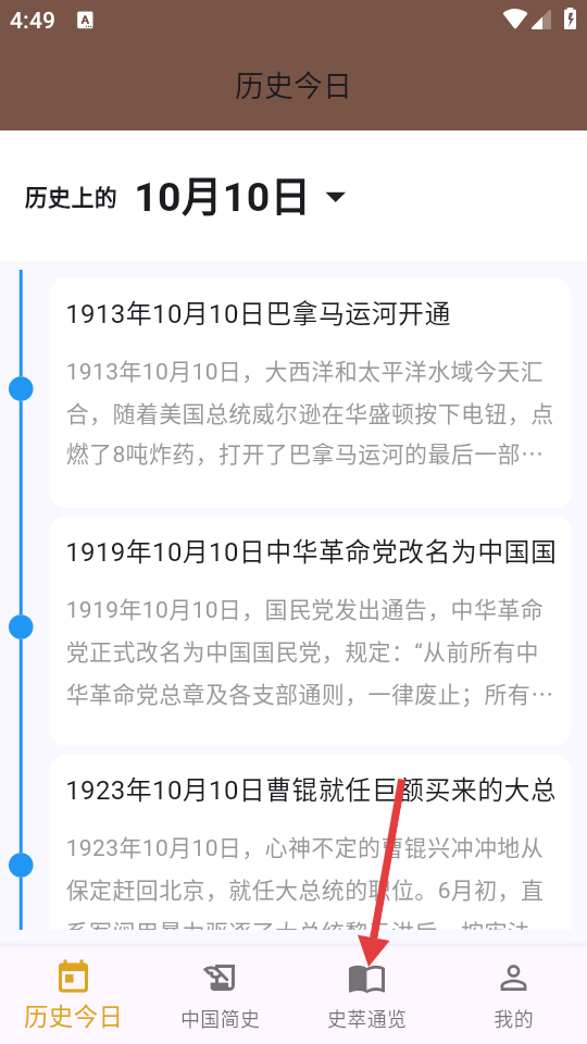 1、在主页面,点击底部导航栏中的【史萃通览】选项。