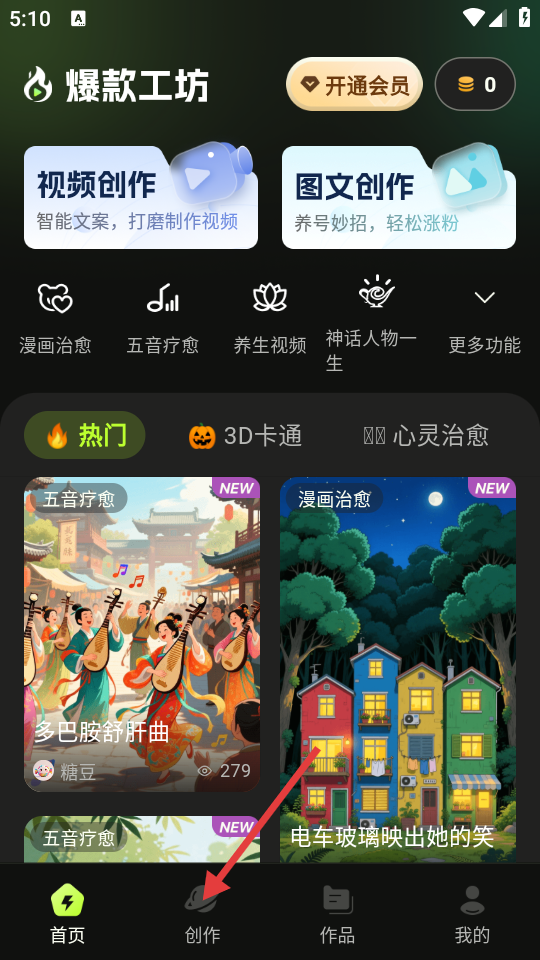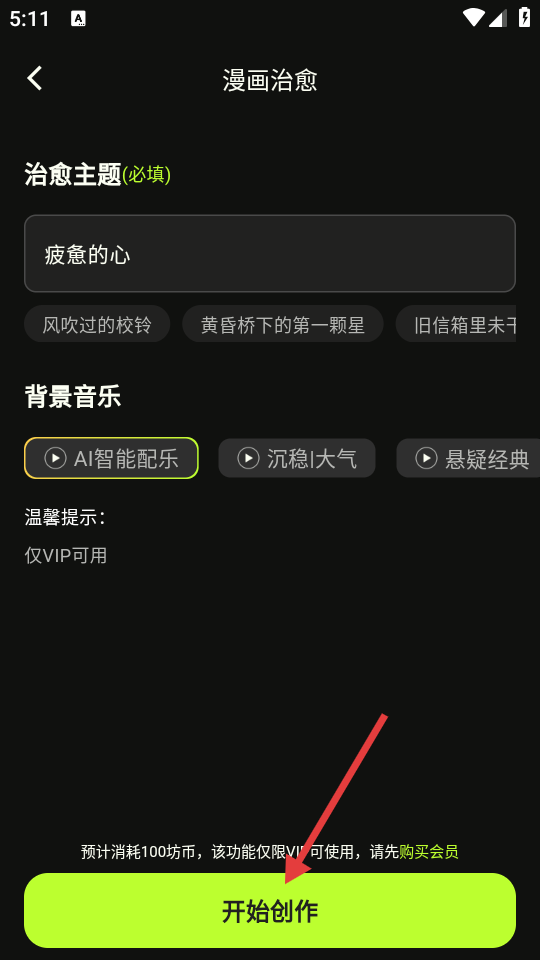 2、进入创作页面后,选择心仪的创作类型(如“漫画治愈”),点击【开始创作】按钮。