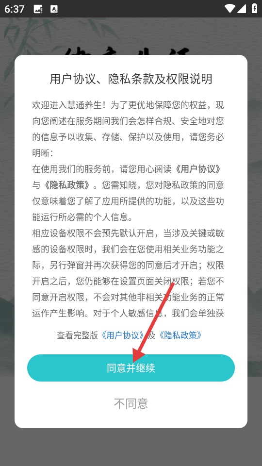 1、在“用户协议、隐私条款及权限说明”弹窗中,点击【同意并继续】按钮。