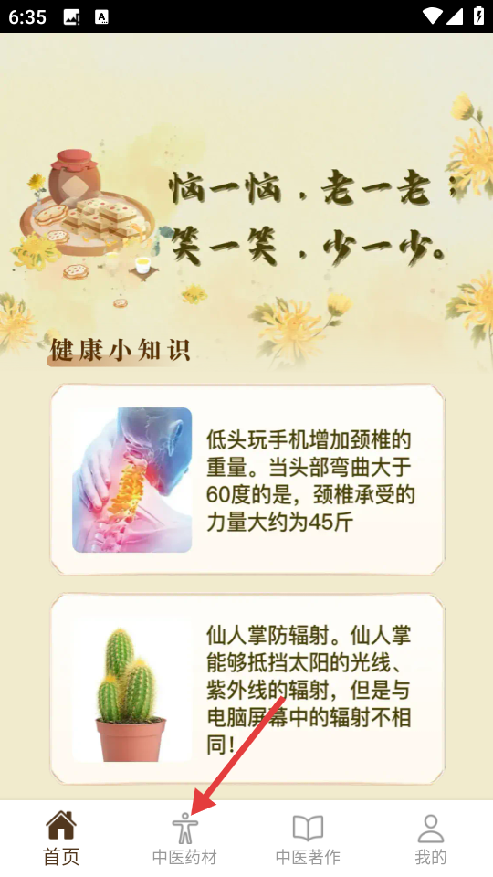 2、进入主页面后,点击底部导航栏中的【中医药材】选项。
