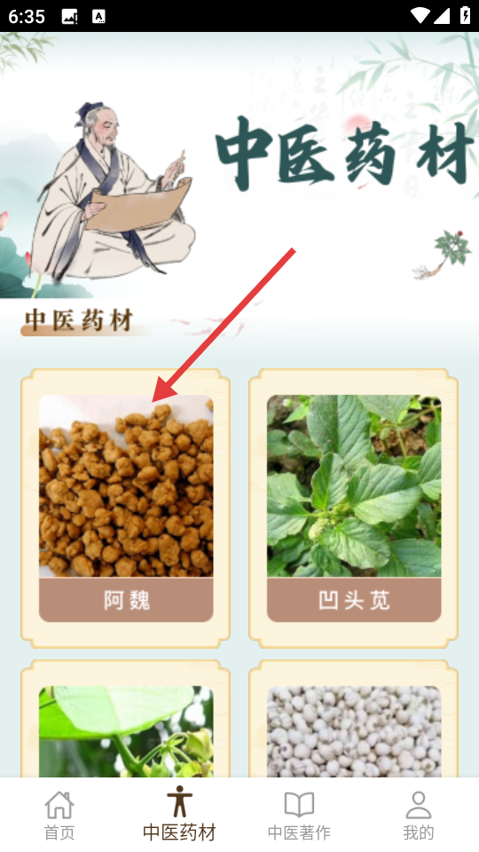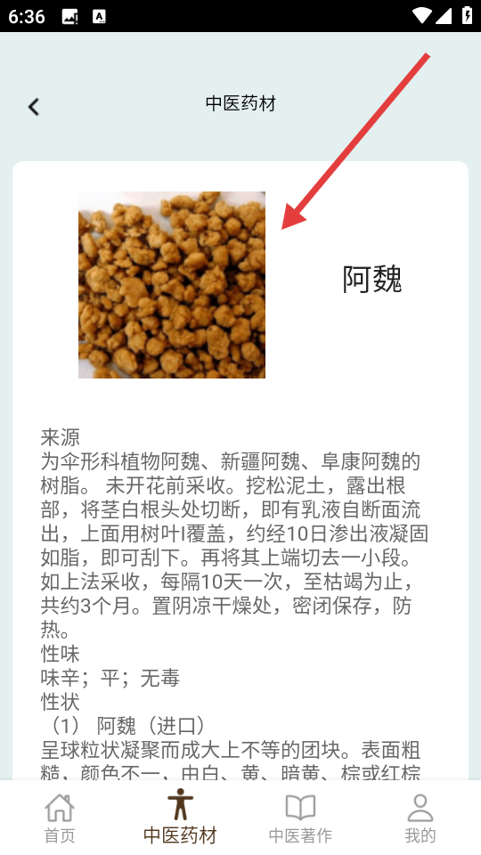 3、在中医药材页面,选择想要查看的中药材(如“阿魏”)。