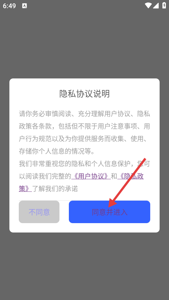 1、在“隐私协议说明”弹窗中,点击【同意并进入】按钮。