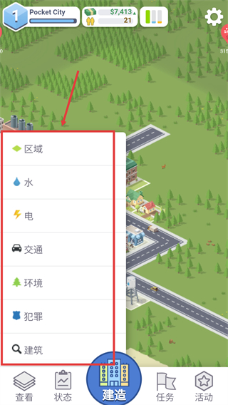 1、点击底部【建造】按钮,展开含【区域】-【水】-【电】等选项的菜单,可选择对应类别进行城市基础建设规划。
