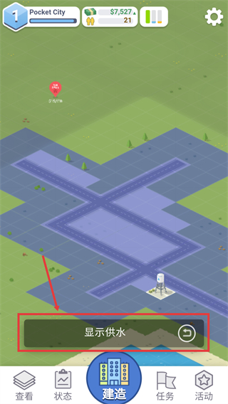 2、在建造界面选择【水】选项后,点击底部【显示供水】按钮,能查看供水覆盖范围,辅助合理布局供水设施。