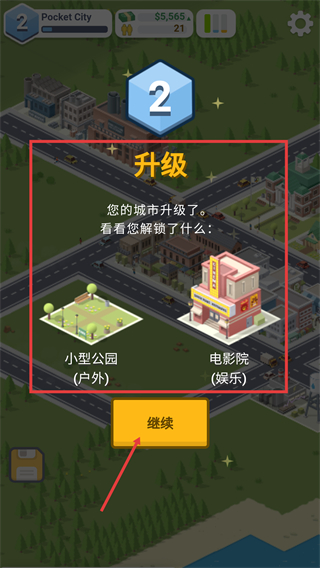 4、城市升级后解锁【小型公园】-【户外】与【电影院】-【娱乐】设施,点击【继续】按钮可返回城市使用新建筑。