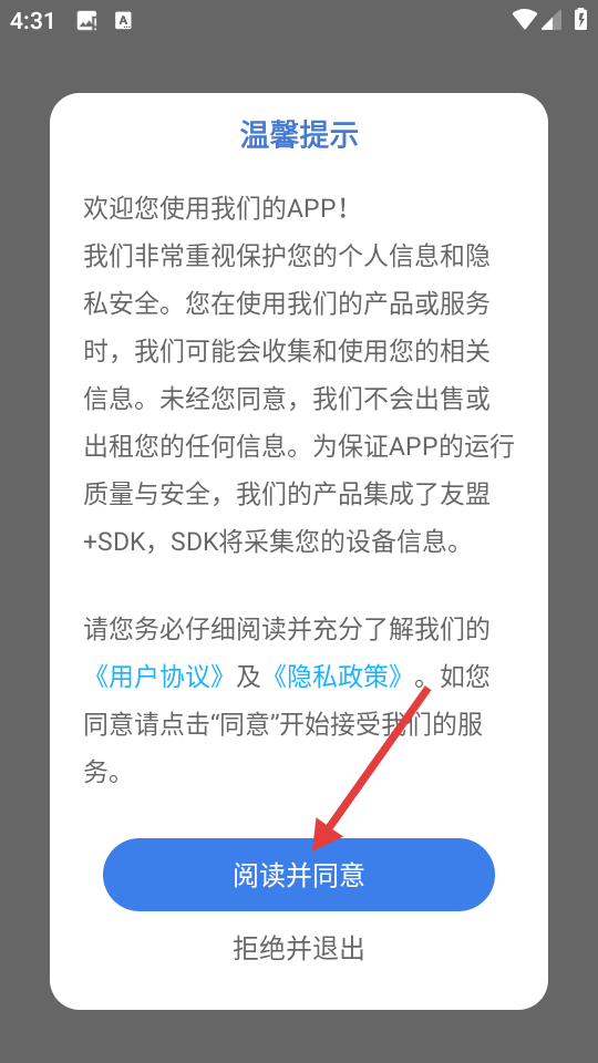 1、首次使用,阅读并同意《用户协议》及《隐私政策》。