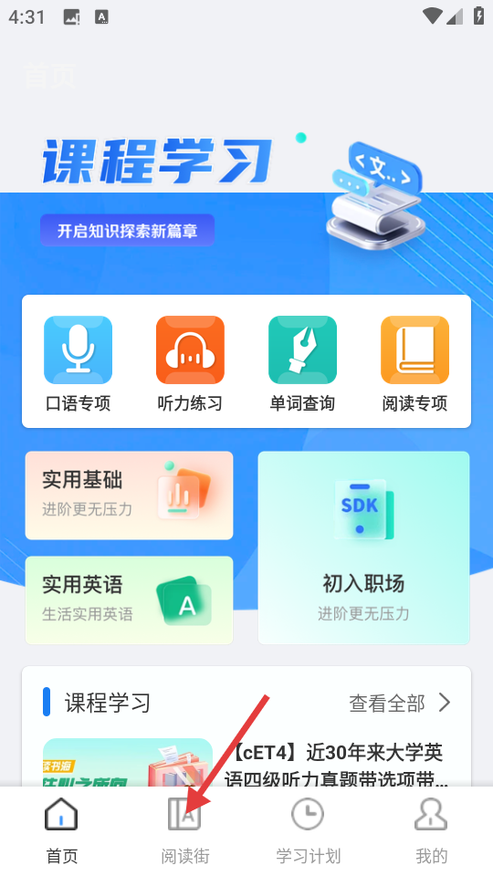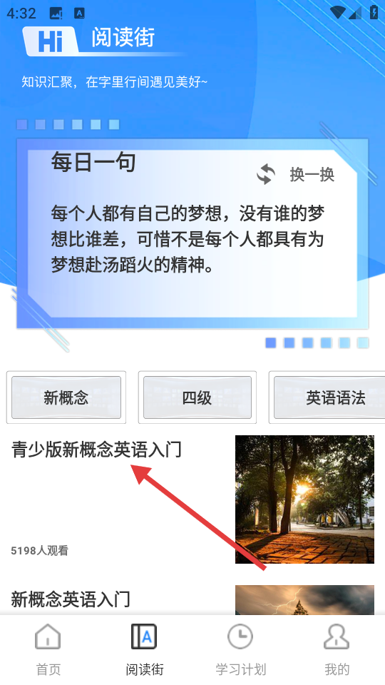 3、在阅读街页面,选择想要学习的内容(如“青少版新概念英语入门”)。