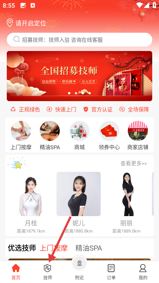 1、在首页点击底部【技师】选项,进入技师列表页面。