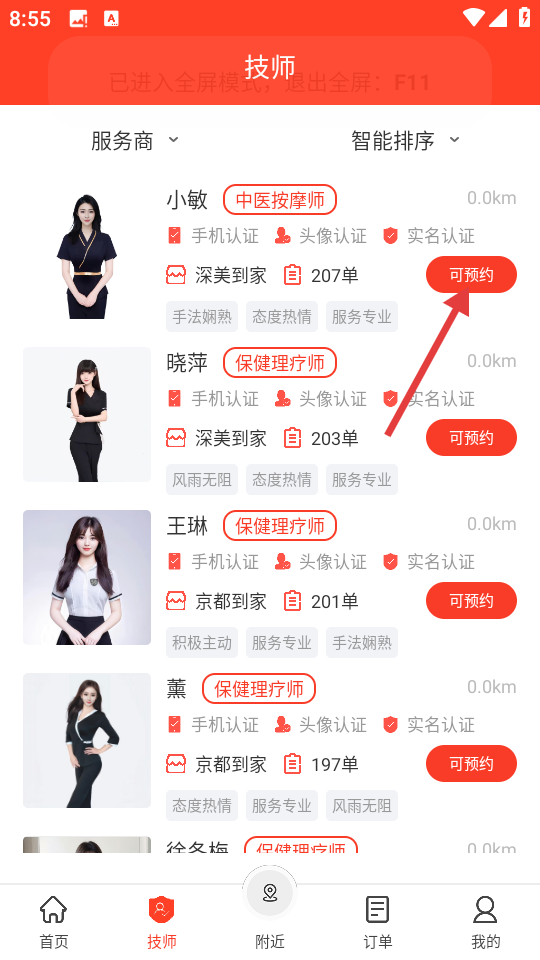 2、在技师列表中,点击技师对应的【可预约】按钮。