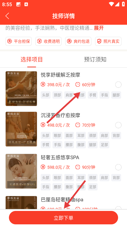 3、进入技师详情页,选择按摩项目后点击【立即下单】。