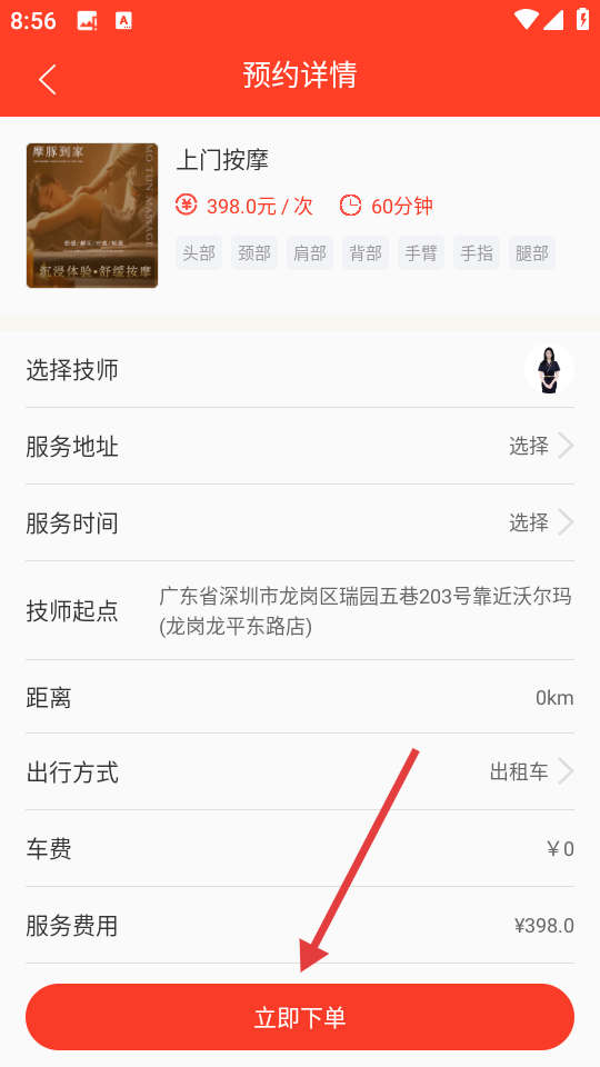 4、在预约详情页,确认信息无误后点击【立即下单】,完成预约。