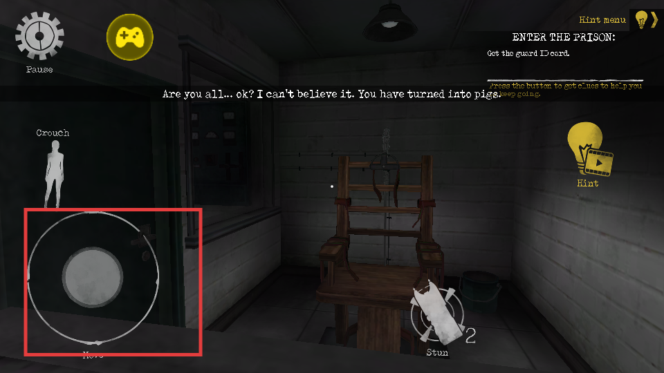2、通过左侧红色方框内的虚拟摇杆控制角色移动,在场景中探索,寻找解谜线索和逃生路径。
