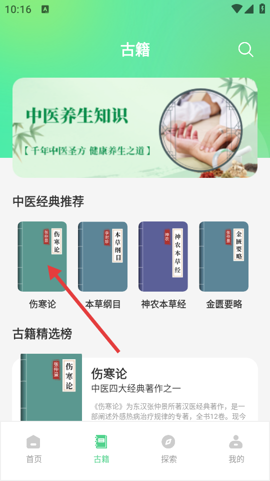2、在【古籍】页面的中医经典推荐中,选择【伤寒论】书籍图标进入详情页。