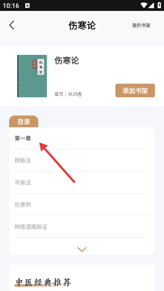 3、在【伤寒论】详情页,点击【第一章】进入章节阅读界面。