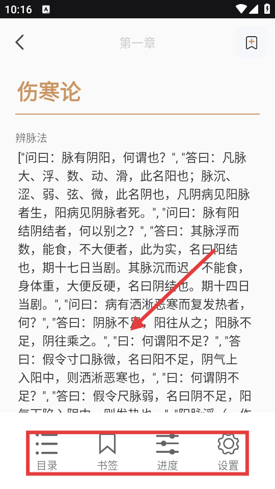 4、进入阅读界面后,可查看【伤寒论】中【辨脉法】的具体内容,且可利用底部的目录、书签等功能辅助阅读。