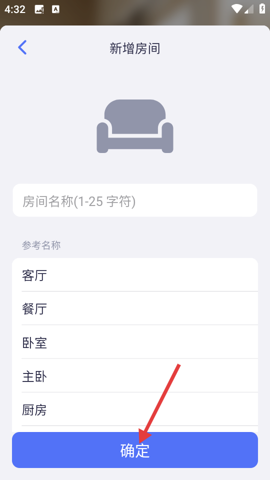 4、在房间名称设置页面,填写房间名称后点击【确定】完成新增房间操作。