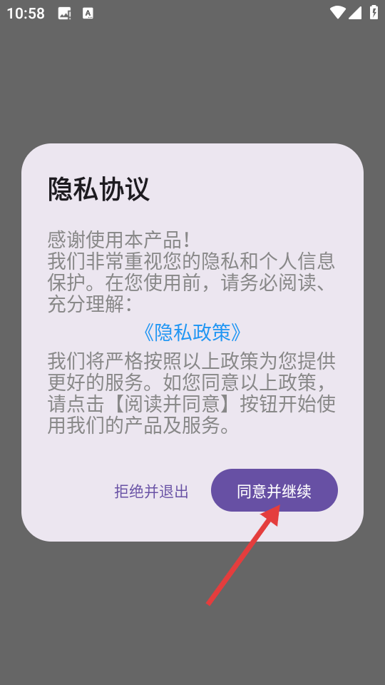 1、点击【同意并继续】按钮,同意隐私协议后进入软件。