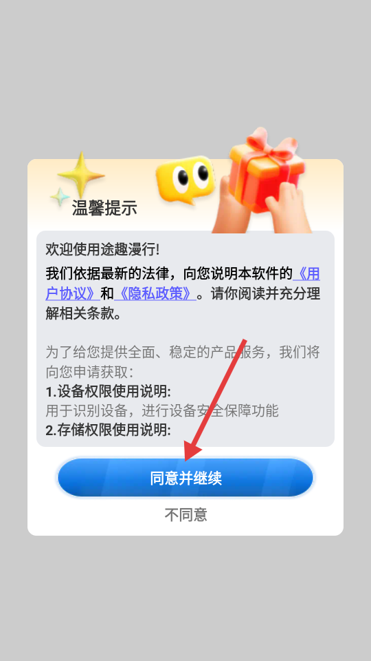 1、点击【同意并继续】按钮,同意用户协议和隐私政策后进入APP。