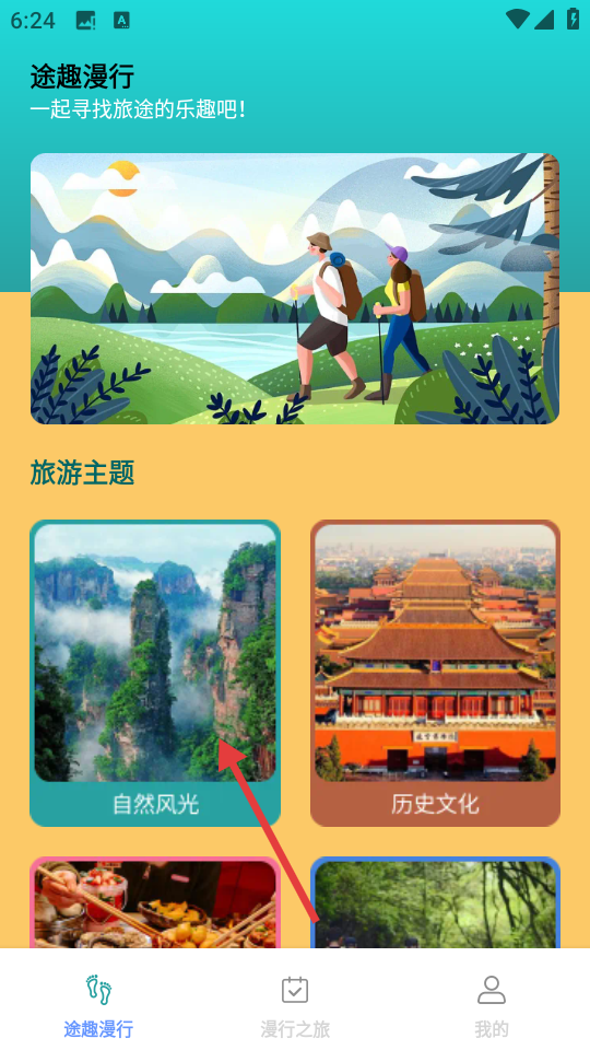 2、在途趣漫行首页选择旅游主题,如【自然风光】。
