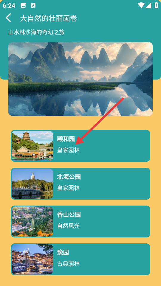 3、在自然风光主题页面中选择景点,如【颐和园】。
