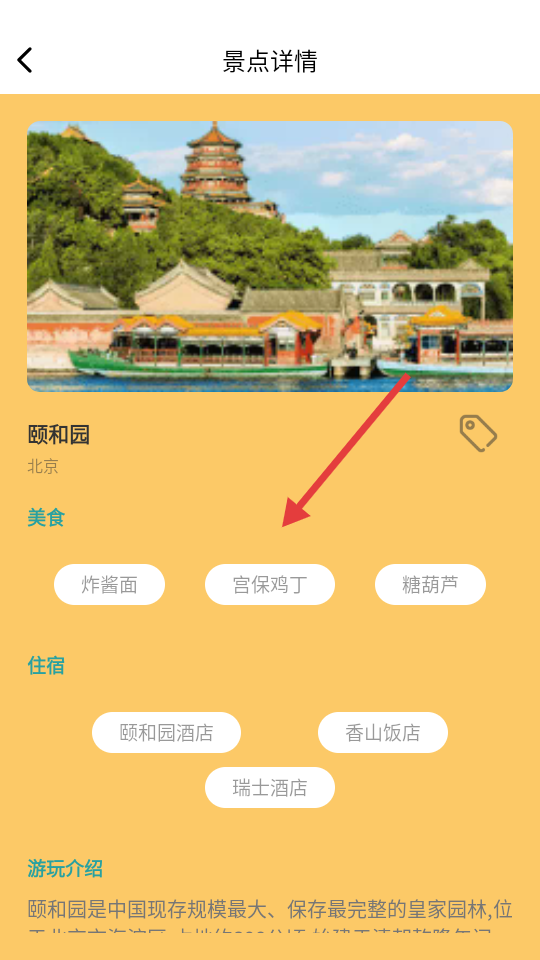 4、进入颐和园景点详情页,可查看美食、住宿、游玩介绍等信息。