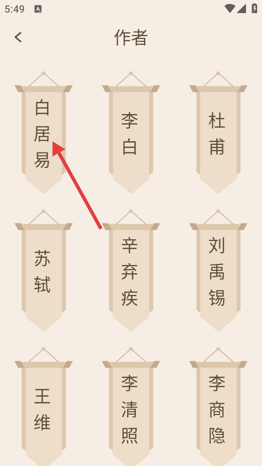 2、在作者列表页面选择【白居易】,进入白居易作品列表页面。