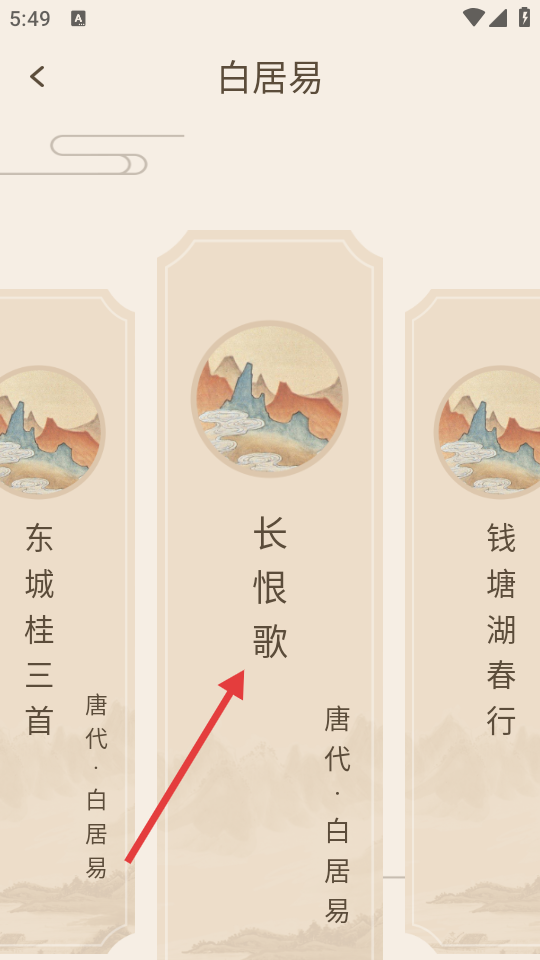 3、在白居易作品列表页面选择【长恨歌】,进入作品详情页面。
