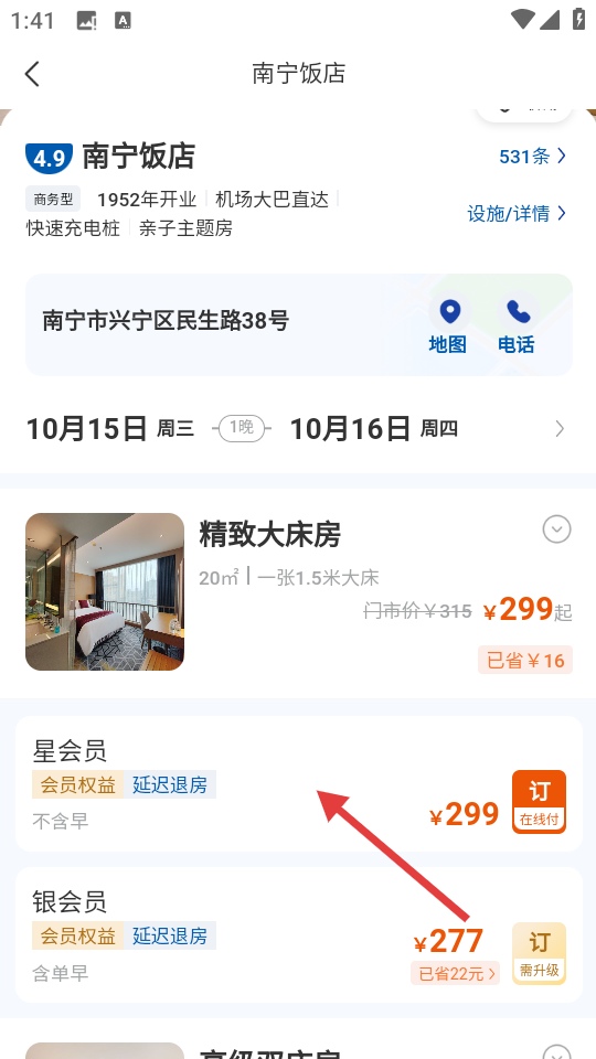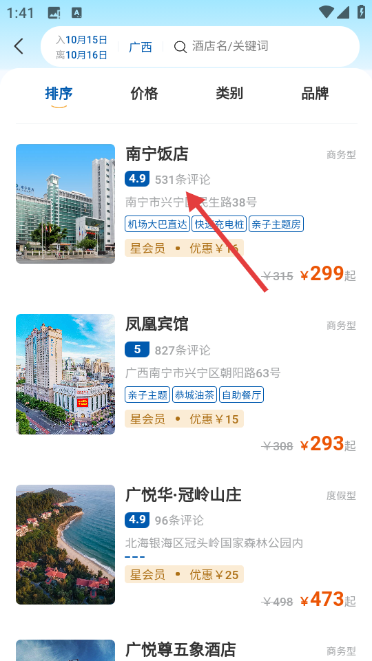 2、在酒店列表中选择【南宁饭店】,进入酒店详情页面。