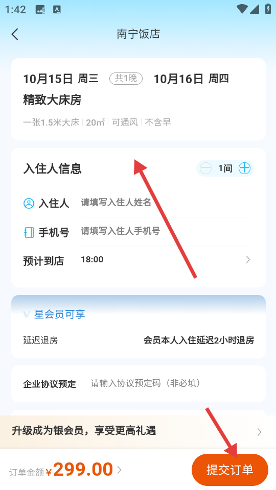 4、在房型预订页面填写入住人信息,确认订单金额后,点击【提交订单】完成预订。