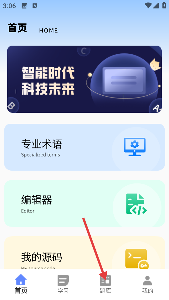 1、在首页中,点击底部【题库】选项,进入题库页面。